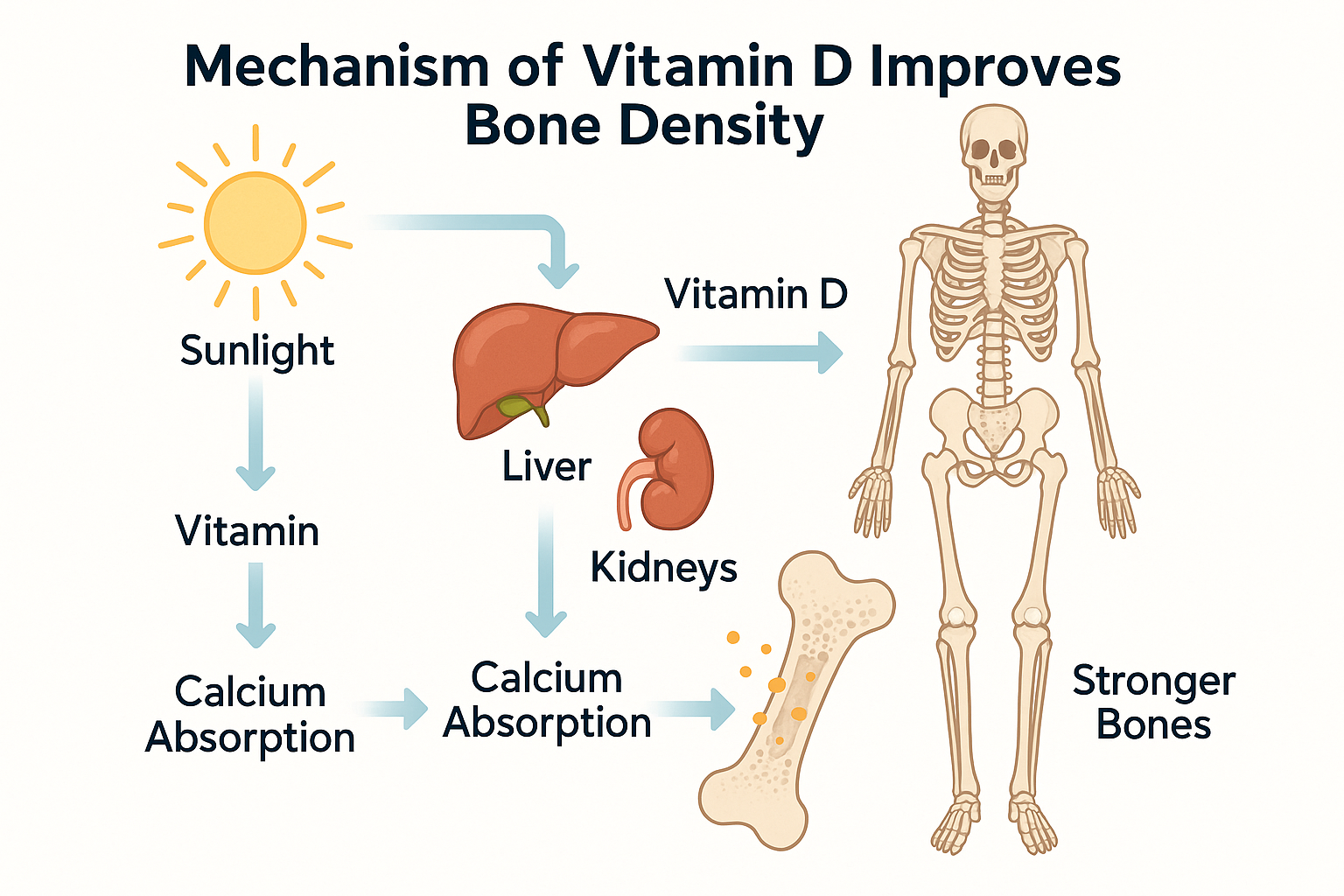 비타민 D는 장에서 칼슘의 흡수를 촉진하는 데 중요한 역할을 합니다. 비타민 D가 부족하면 칼슘 흡수가 감소하게 되어, 혈중 칼슘 농도를 유지하기 위해 뼈에서 칼슘이 방출됩니다. 이로 인해 골밀도가 감소하고 골다공증 위험이 증가합니다. 비타민 D가 적정 수준에 있을 경우, 칼슘의 흡수율이 높아지며, 이는 뼈의 미네랄 밀도를 증가시키는 데 도움을 줍니다. 비타민 D는 장관에서 칼슘과 인을 흡수하는 단백질을 활성화시키는 방식으로 이를 돕습니다.